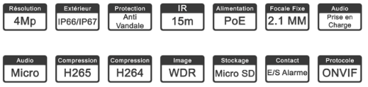 - Compression : H.265, H.264, H.264B, MJPEG (pour le sous-flux).