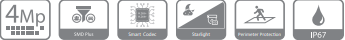 Cette caméra utilise un capteur CMOS 1/3" 4 MP, permettant une capture d’image nette à une résolution maximale de 2688 × 1520. La technologie Starlight intégrée garantit des performances supérieures en faible luminosité, produisant des images claires et colorées dans des environnements sombres. L'illumination minimale de 0,005 lux en mode couleur et 0,0005 lux en mode noir et blanc permet à la caméra de fonctionner efficacement sans éclairage supplémentaire.